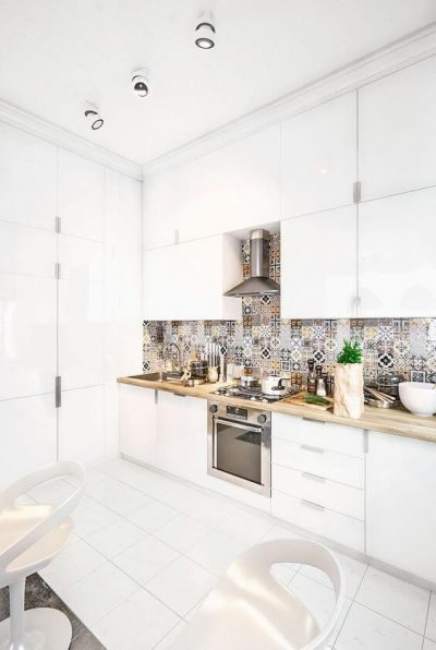 Bucatarie Cu Mobila Alba Blat Gri Si Mozaic Pe Pereti Alb Gri